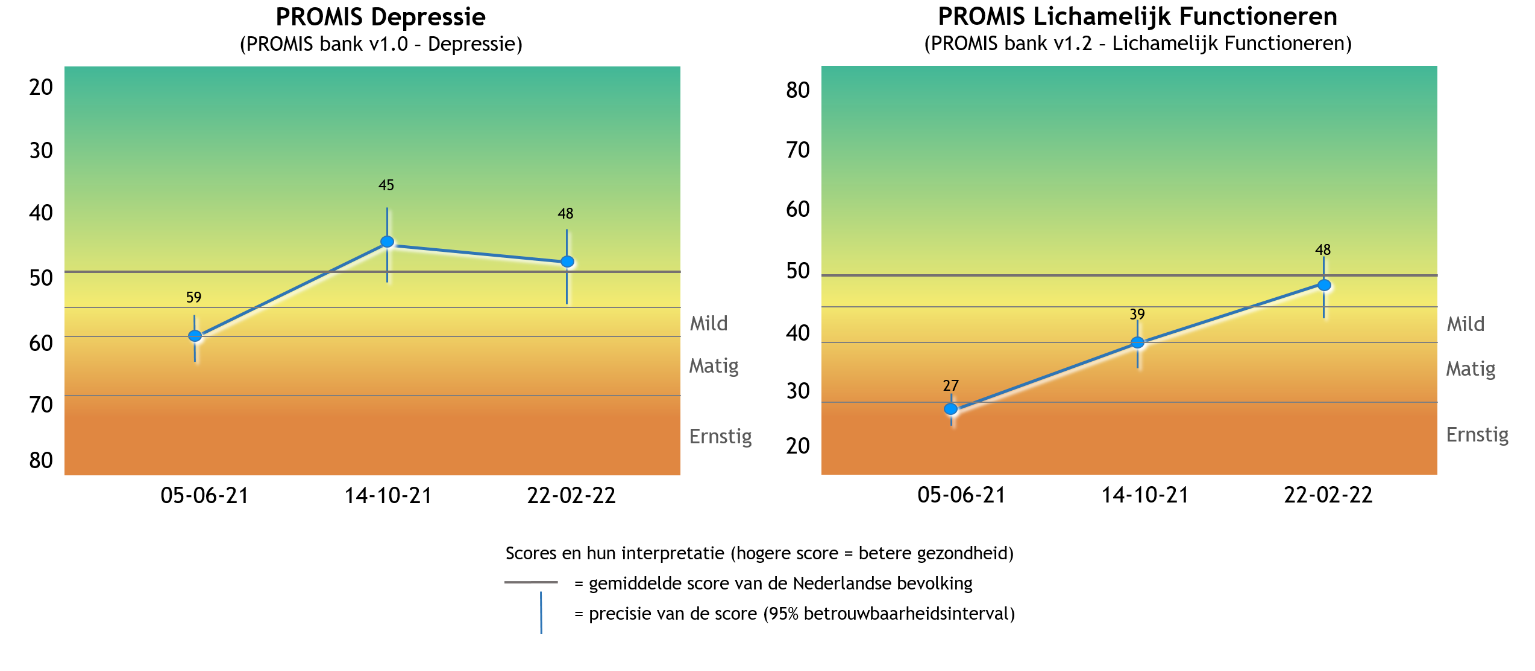 Voor de klinische praktijk wordt gestreefd naar een zo duidelijk en eenduidig mogelijke terugkoppeling van PROMIS T-scores aan zorgverleners en patiënten. Hierbij is gekozen voor een lijngrafiek waarbij scores over de tijd weergegeven worden op een achtergrond waarop de ernst van de score in kleur aangegeven wordt. Bij ieder meetmoment wordt de T-score plus de meetfout (de betrouwbaarheid van de score) weergegeven. Voor domeinen waarbij een hogere T-score meer symptomen betekent is de Y-as omgedraaid om verwarring te voorkomen en om consistent te zijn in de betekenis van de richting van de lijnen (hoger is beter).